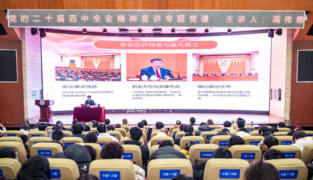 12月3日,党委副书记、校长周传德以《学习贯彻党的二十届四中全会精神》为题,为发展规划处、机械工程学院师生讲授专题党课。